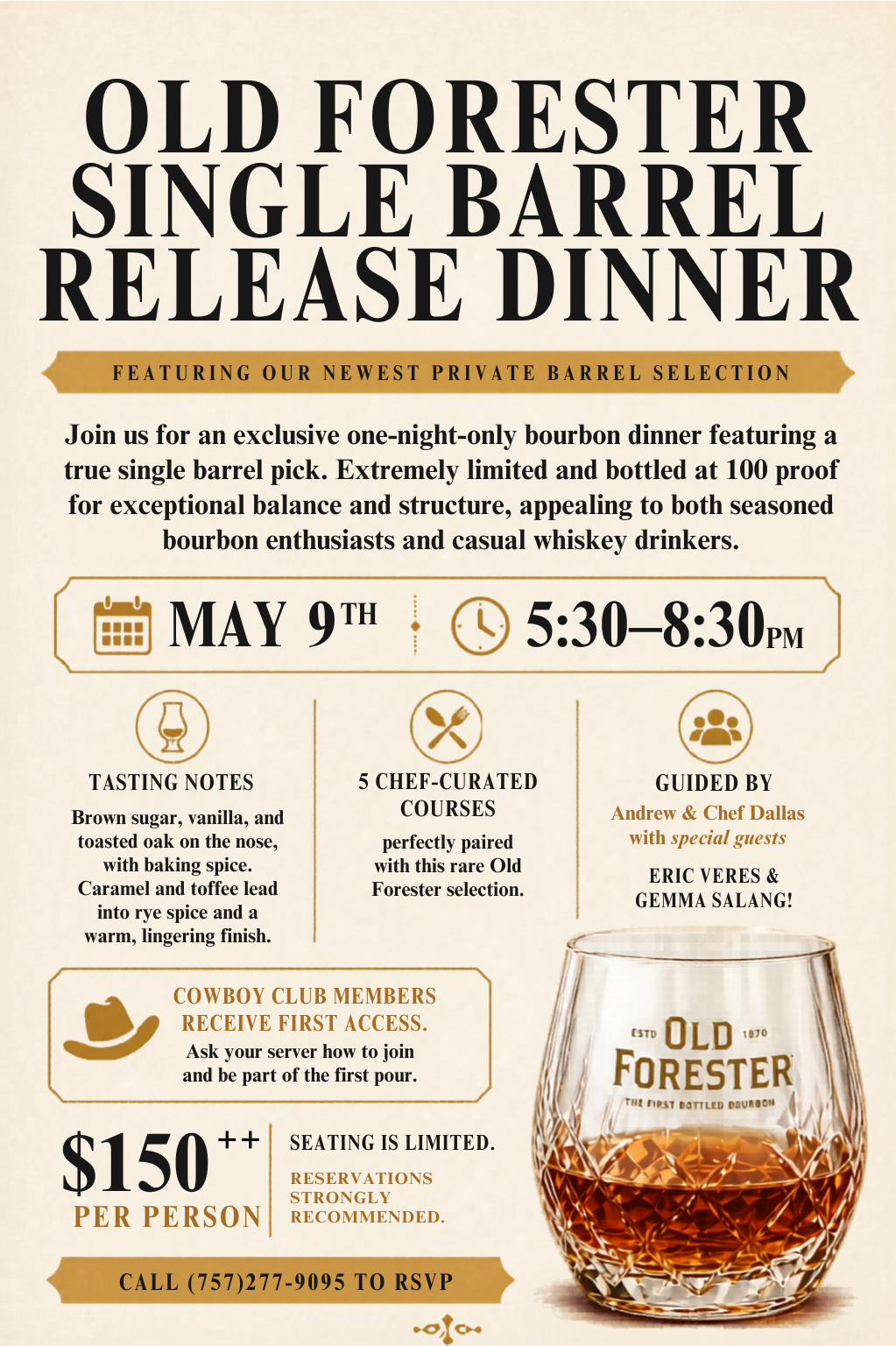 Join us for our Old Forester Single Barrel Release Dinner, featuring our newest private barrel selection.